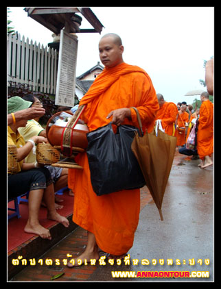 วันนี้พวกเราตื่นกันตั้งแต่ 05.30 ตั้งใจที่จะมาตักบัตรข้าวเหนียวที่หลวงพระบาง เราเดินทางไปยังจุดที่มีการตักบาตรข้าวเหนียวบริเวณถนนใจกลางหลวงพระบาง ครั้งไปถึงถนนดังกล่าวมีแม่ค้านำข้าวเหนียวมาจำหน่ายกระติ๊บละ 50 และ 100 บาท หลังจากที่พวกเราได้ข้าวเหนียวใส่บาตรแล้ว แม่ค้าจะนำเสื่อมาปูให้บริเวณริมถนนเพื่อให้พวกเราได้ใส่บาตร ครั้นถึงเวลา 06.00 น. พระสงฆ์จึงมาบิณฑบาตรเป็นจำนวนมาก จนเห็นแถวยาวไปสุดถนน หลังจากที่พวกเราได้ทำบุญแล้ว ก็เดินเท้าไปยังตลาดเช้าที่เมืองหลวงพระบางต่อ