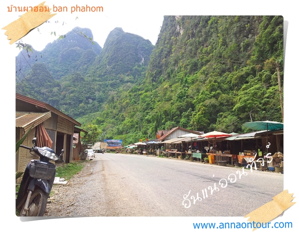 บ้านผาฮอม เป็นหมู่บ้านเล็ก ๆ ที่อยู่ติดริมถนนเส้นทางขึ้นไปยังทางตอนเหนือของลาว ใครที่เดินทางไปหลวงพระบาง จากเมืองเวียงจัน หรือเมืองวังเวียง ก็จะเจอบ้านผาฮอมแน่นอน ที่บ้านผาฮอมสังเกตได้ไม่ยากเวลาขับรถผ่านบ้านผาฮอมนี้ จะเจอกับร้านค้า ร้านอาหารมากมาย มีหน้าผาสูงใหญ่ขนาบสองข้าง จึงทำให้หมูบ้านนี้ร่มเย็น และดูสวยงามมากเลย จึงทำให้เกิดเป็นแหล่งที่ตั้งของฝากของขายมากมาเลย จนทำให้จุดนี้เป็นจุดแวะซื้อของฝากบ้านผาฮอม แต่ก่อนหน้านี้ประมาณเมืองปี 2550 บ้านผาฮอมเป็นเส้นทางที่นักท่องเที่ยวรู้จักน้อยมาก และไม่ค่อยแวะมาดูหรือมาซื้อของซักเท่าไร ส่วนใหญ่จะเป็นคนลาวเท่านั้นที่จะแวะมาซื้อของฝากของกิน โดยเฉพาะเนื้อสัตว์ต่าง ๆ มากมาย อาทิ เก้ง เลียงผา หมูป่า อีเห็น เม่น กระรอกแดง ไม่ว่าจะเป็นของสด หรือของตากแห้ง ก็มีให้เห็นคละกันไปหลาย ๆ ร้าน และก็มีพืชป่า ของป่า อาทิ หน่อไม้ เห็ด แต่ที่ขาดไม่ได้และมีอยู่เยอะมาทุกวันนี้ เป็นสินค้าขึ้นชื่อบ้านผาหอมก็คือ ปูห้วย หรือปูหิน ที่ต้องไปจับมาในป่า นอกจากนี้ยังมีของฝากอีกมากมาย ซึ่งในปัจจุบันก็ยังมีอยู่เยอะ สามารถนำไปเป็นยาโดบ ยาชูกำลัง ตามความเชื่อ ก็มี กะเพาะเม่น ดีเสือ ดีหมี น้ำผึ้งป่า นกป่า ไก่ป่า อุ้งตีนหมี พืชสมุนไพร น้ำมันเลียงผา เขี้ยวเสือ เขี้ยวหมูป่า เหล้าดองยา เพราะฉะนั้นได้มาที่บ้านผาฮอมก็จะได้เห็นสินค้าต่าง ๆ เหล่านี้มากมาย รับรองคุณจะเพลินกับการเลือกซื้อของฝาก และของที่ในประเทศไทยเราน้อยนักที่จะมาตั้งขายเรียงรายกันขนาดนี้ สำหรับผมแล้วทริปนี้ผมมาบ้านผาฮอมนับครั้งไม่ถ้วนเพราะชอบบรรยากาศบ้านผาฮอม เพราะวิวหลังเขาสวยมาก และเขานี้แหละจะเป็นกำบังกันแดดกันฝนกันลมให้กับคนบ้านผาฮอมที่นี่ลยอยู่กับอย่างสบายแบบไม่ต้องกลัวพายุ